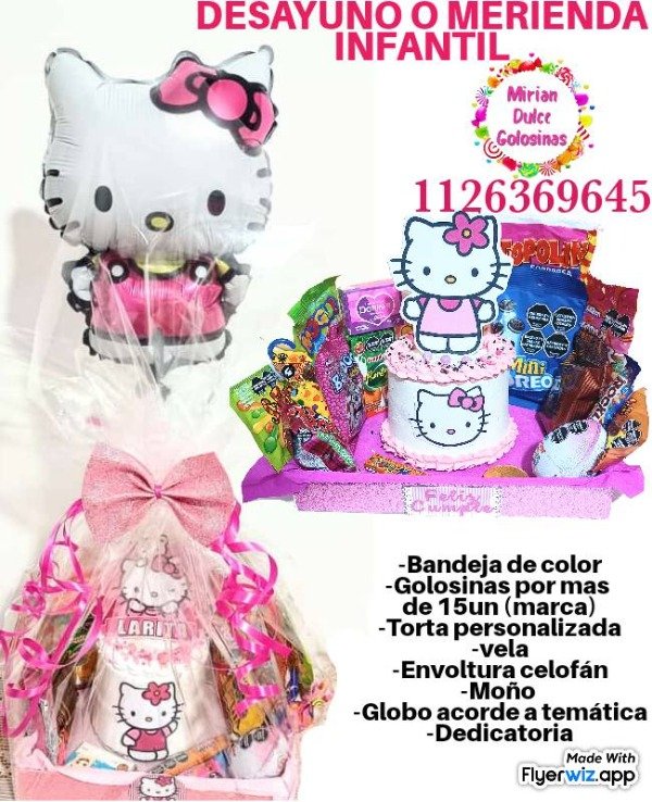 Hacemos desayunos/meriendas para niños, que es la tortita personalizada + las golosinas que ves + vela + envoltura en celofán con moño, tarjeta y globo acordé a la temática.todos son productos de marca ya reconocida.Retiran en mi domicilio o Se hacen envios!!!