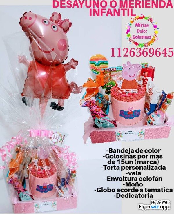 Hacemos desayunos/meriendas para niños, que es la tortita personalizada + las golosinas que ves + vela + envoltura en celofán con moño, tarjeta y globo acordé a la temática.todos son productos de marca ya reconocida.Retiran en mi domicilio o Se hacen envios!!!
